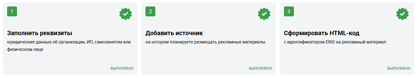 - отчитываться в Единый реестр интернет-рекламы (ЕРИР). Для этого нужно получить уникальный токен на каждый рекламный материал и передать сведения о его размещении — всё через оператора рекламных данных (ОРД).